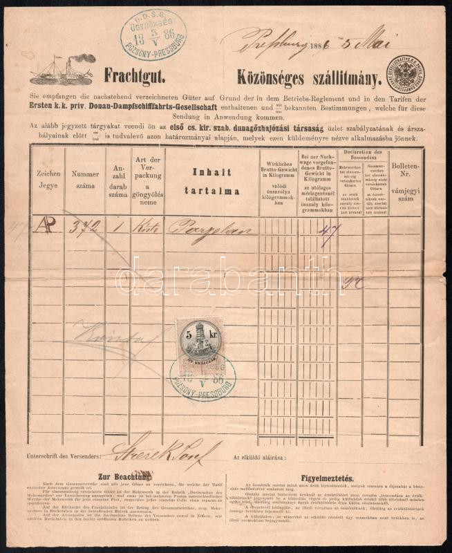 Beschreibung: 1886 Pozsony (Pressburg), Első Duna-Gőzhajózási Társaság (DDSG) fuvarlevél, 5kr okmánybélyeggel