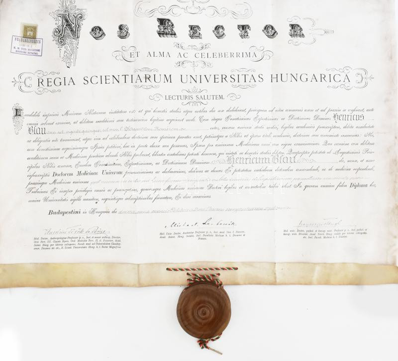 1908 Blau Henrik (Hollán Henrik (1882-1971)) Szent Rókus Kórház igazgatóhelyettesének, belgyógyász, kórháztörténésznek doktori diplomája, pergamen, Budapesti Tudományegyetem (ELTE), Ponori Török Aurél orvos, rektor, Lenhossék Mihály anatómus, dékán, és Tangl Ferenc fiziológus, humán és állatorvos aláírásaival. Fatokos függőpecséttel, kis sérüléssel a pecséten, eredeti, sérült tokban, a pergamen háta foltos.