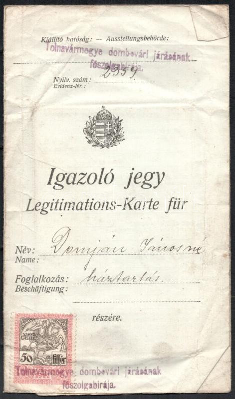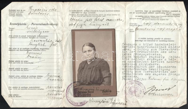 Beschreibung: 1916 Fényképes igazolójegy háztartásbeli asszony számára katonai fia meglátogatása okán