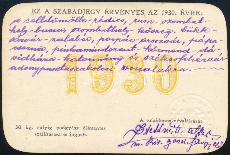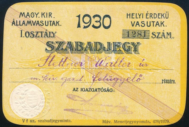 1930 MÁV szabadjegy I. osztály https://www.darabanth.com/de/455-Fernauktion/455.0/Kunst-Dokumente-andere-Sammelgebiete/Dokument~500020/1930-MAV-szabadjegy-I-osztaly~II3038565