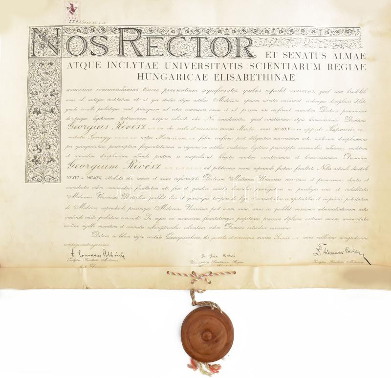 1939 Révész György (1915-1986) orvos, fül-orr-gégész, egyetemi tanár, Hollán Zsuzsa (1920-2008) orvos, hematológus, egyetemi tanár férjének orvos doktori diplomája, papír, Pécs, Erzsébet Erzsébet Tudományegyetem, Albrich Konrád orvos, szemész, dékán, Birkás Géza irodalom- és művelődéstörténész, nyelvész, rektor, Gorka Sándor biológus aláírásaival. Fatokos függőpecséttel, kissé sérült pecséttel, eredeti sérült tokban.