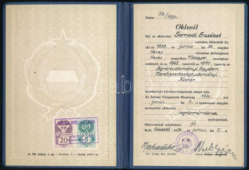 1965-1970 Agrármérnöki egyetemi leckekönyv és oklevél https://www.darabanth.com/de/455-Fernauktion/455.0/Kunst-Dokumente-andere-Sammelgebiete/Dokument~500020/1965-1970-Agrarmernoki-egyetemi-leckekonyv-es-oklevel~II3037455