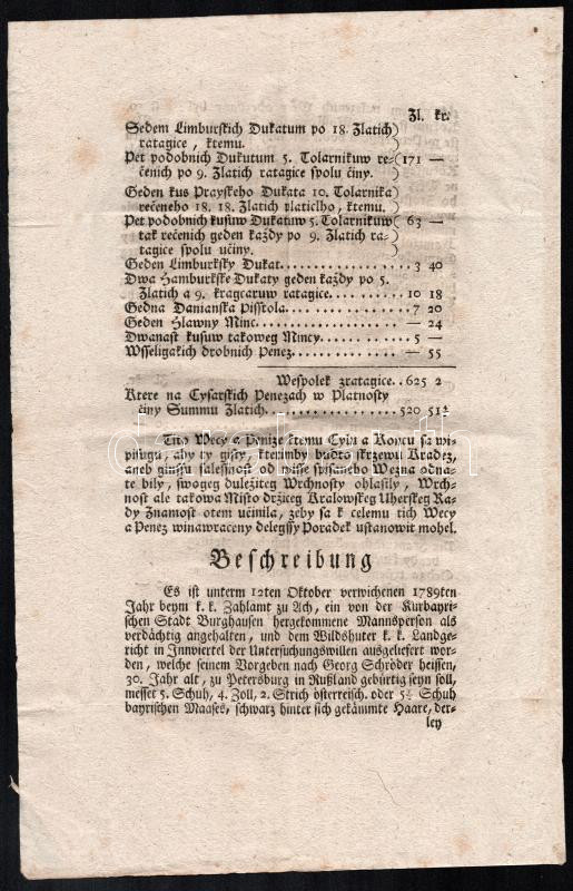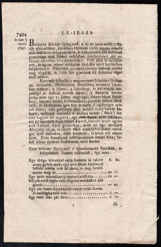 Beschreibung: 1790 Körözvény lopási ügyben, német és magyar nyelven