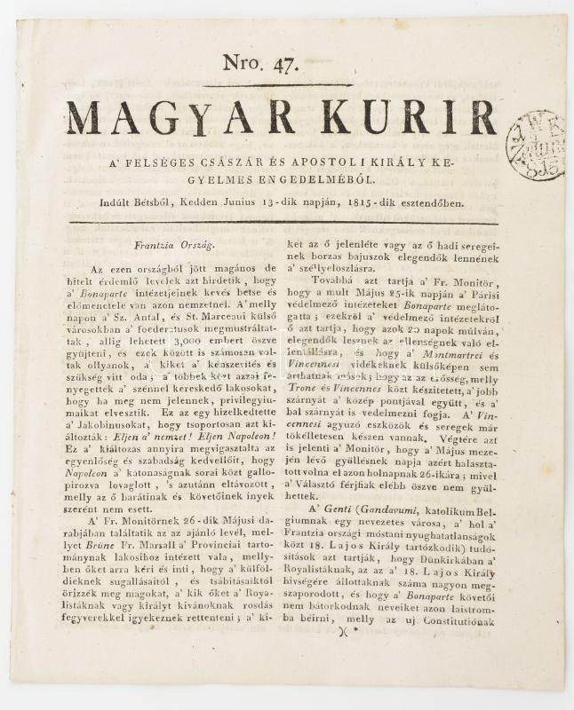 1815 Magyar Kurir 47. száma, "Indúlt Bétsből, Kedden Junius 13-dik napján, 1815-dik esztendőben", 274-278 p. + Honnyi Levelek, Tudosítások, és Egyebek. A' Magyar Kurir 47-dik darabjához, (2) p.