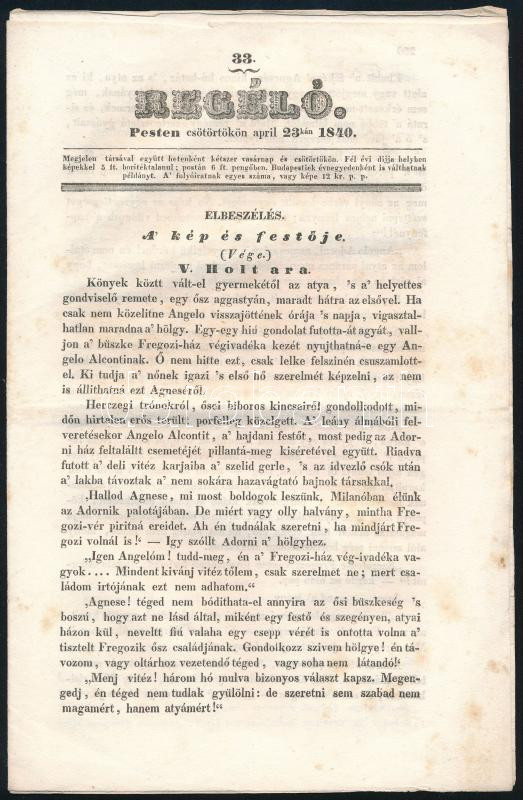 1840 Regélő 33. száma, 1840. ápr. 23., Pest, Trattner-Károlyi-ny., 260... https://www.darabanth.com/de/455-Fernauktion/455.0/Kunst-Dokumente-andere-Sammelgebiete/Drucksachen~2000012/1840-Regelo-33-szama-1840-apr-23-Pest-Trattner-Karolyi-ny-260-266-p~II3039994