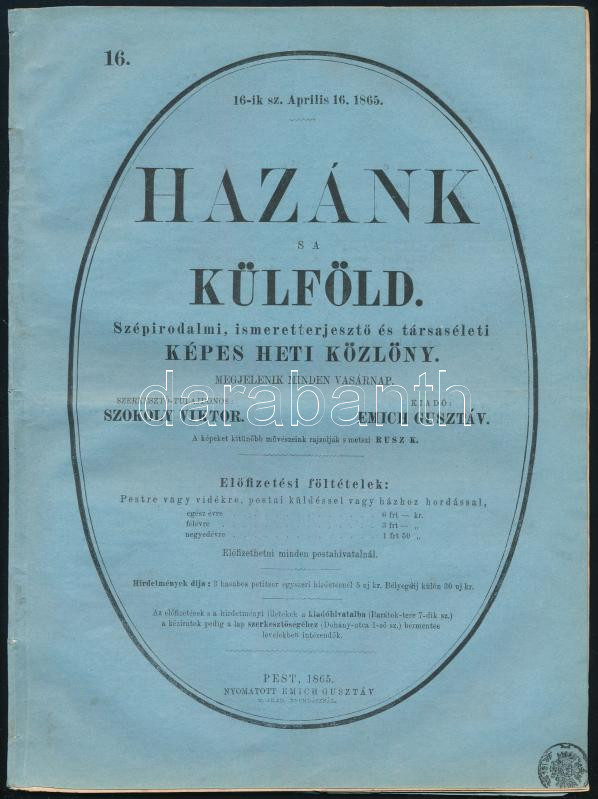1865 Hazánk s a külföld 16. szám, fametszetű illusztrációkkal https://www.darabanth.com/de/455-Fernauktion/455.0/Kunst-Dokumente-andere-Sammelgebiete/Drucksachen~2000012/1865-Hazank-s-a-kulfold-16-szam-fametszetu-illusztraciokkal~II3040853
