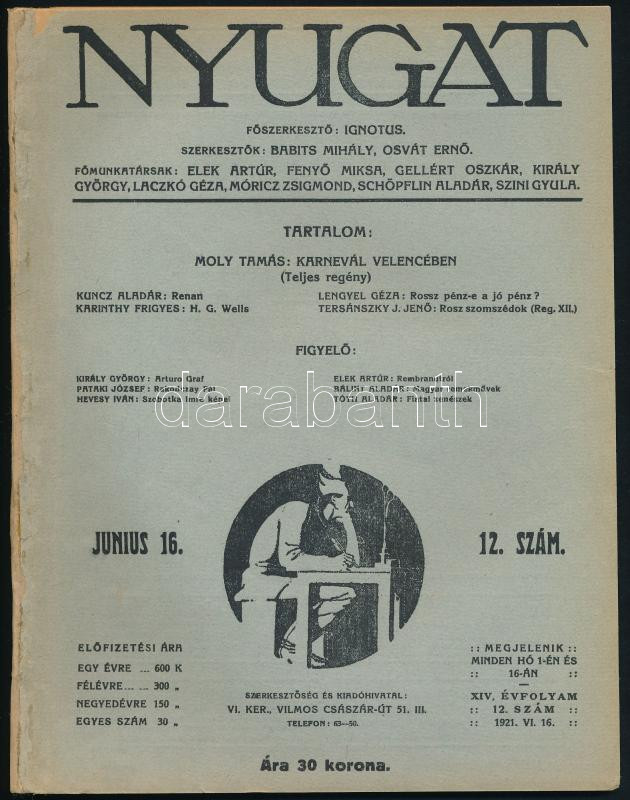 1921 A Nyugat XIV: évf. 12. szám. a tartalomból: Kuncz Aladár: Rénan, Karinthy Frigyes: H. G. Wells, Tersánszky: Rossz szomszédok. Emellett még Hevesy Iván ,Király György és mások írásaival. Javított gerinccel, jó állapotban