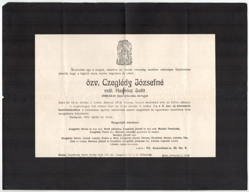 Beschreibung: 1929 özv. Czeglédy Józsefné, Czeglédy József 1848/49-es honvédtizedes özvegyének halálozási értesítője, hajtásnyomokkal, 23x30 cm