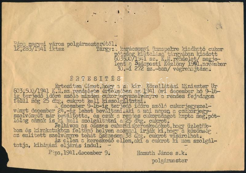 Beschreibung: 1941 - Hivatalos Közlemény Pápa megyei város polgármesterétől a karácsonyi ünnepekre kiadható cukor pótadag tárgyában, stencil-lap