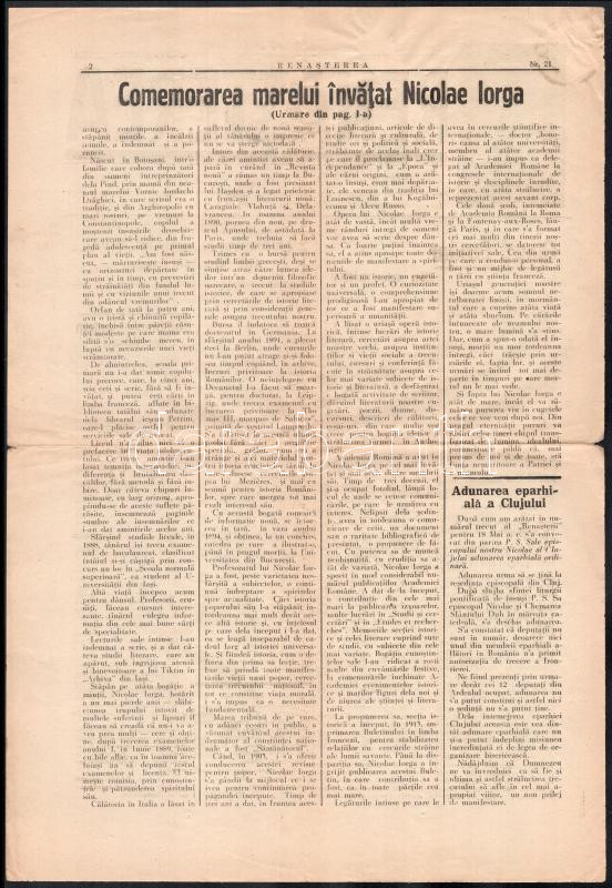 Beschreibung: 1941 Renasterea c. román nyelvű folyóirat XIX. évf. 21. száma, 1941. máj. 25., 2 p. / Romanian language journal