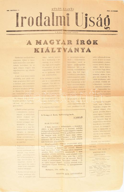 1956. október 23. Az Irodalmi Újság különkiadása, benne a Magyar Írók ... https://www.darabanth.com/de/455-Fernauktion/455.0/Kunst-Dokumente-andere-Sammelgebiete/Drucksachen~2000012/1956-oktober-23-Az-Irodalmi-Ujsag-kulonkiadasa-benne-a-Magyar-Irok-Kialtvanya~II3033303