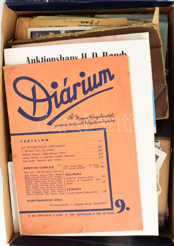 Nagy cipősdoboznyi vegyes papírrégiség tétel, közte legalább 250 régi fotó, nagyon sok képeslap, családi diák New York, útlevél, jogosítvány, régi magyar-latin szótár, numizmatikai aukció katalógusa, nyomtatványok, turisztikai kiadványok, néhány levél és kártyanaptár stb. Vegyes állapotban. Érdekes, átnézésre érdemes!