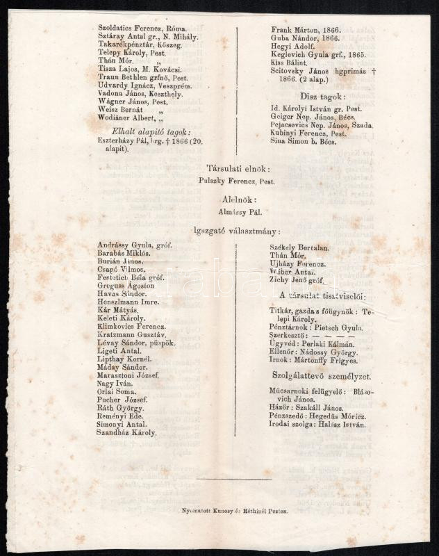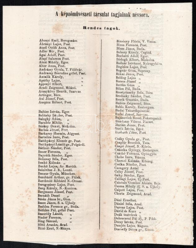 Beschreibung: cca 1870 A Képzőművészeti Társulat kitöltetlen alapító (adomány) levele, benne a Képzőművészeti Társulat tagjainak névsorával