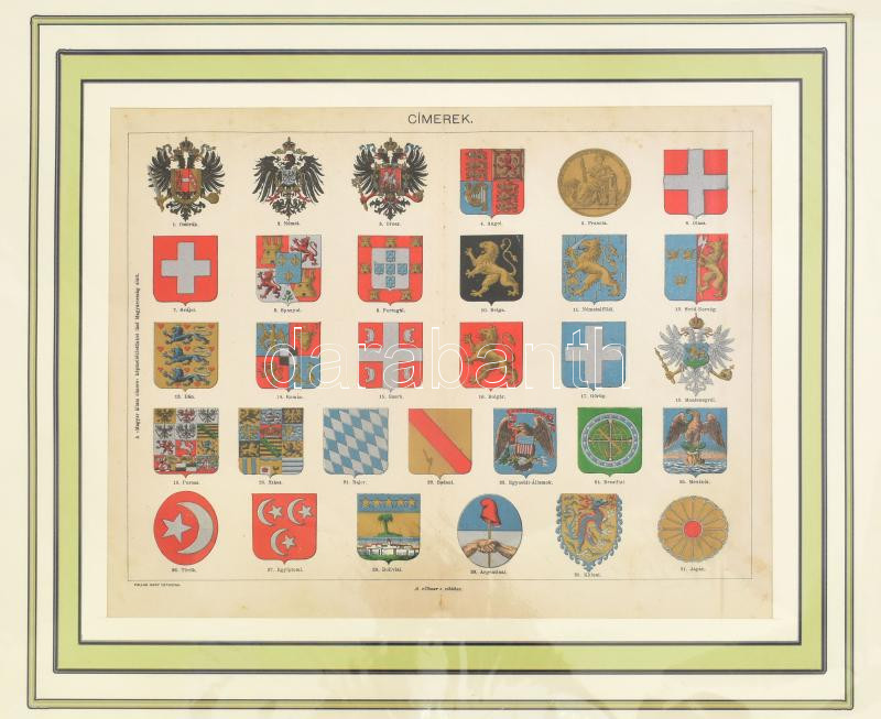 cca 1896 Címerek, nyomat, papír, Pallas Nagy Lexikona, 22,5x28 cm, mod... https://www.darabanth.com/de/455-Fernauktion/455.0/Kunst-Dokumente-andere-Sammelgebiete/Drucksachen~2000012/cca-1896-Cimerek-nyomat-papir-Pallas-Nagy-Lexikona-22-5x28-cm-modern-paszpartuban-lap-szele~II3036287