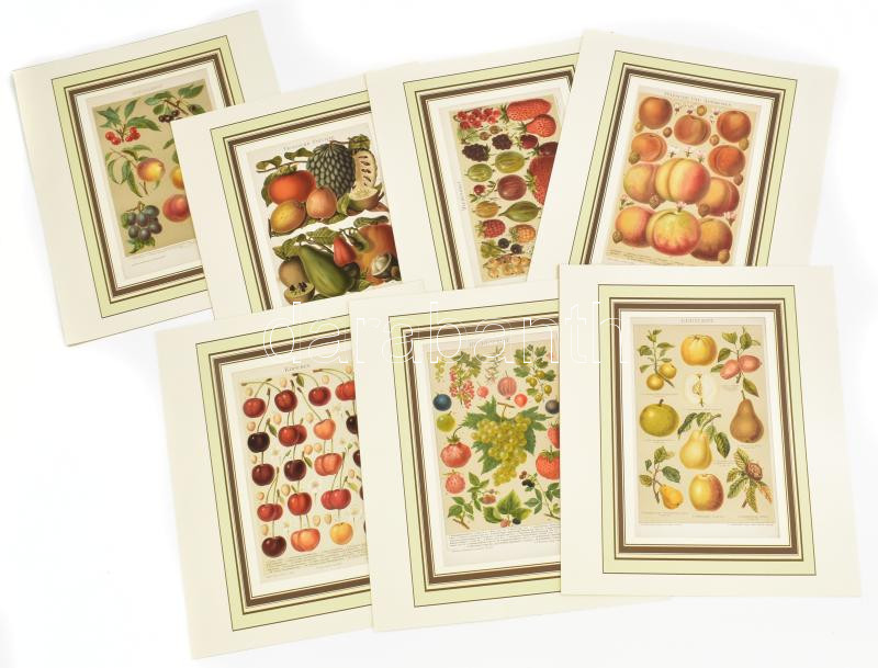 cca 1900 7 db gyümölcs témájú illusztráció a Brockhaus és a Meyer's Lexikonból, nyomat, papír, modern paszpartuban, egyik kissé foltos, 12x21 cm körüli méretben