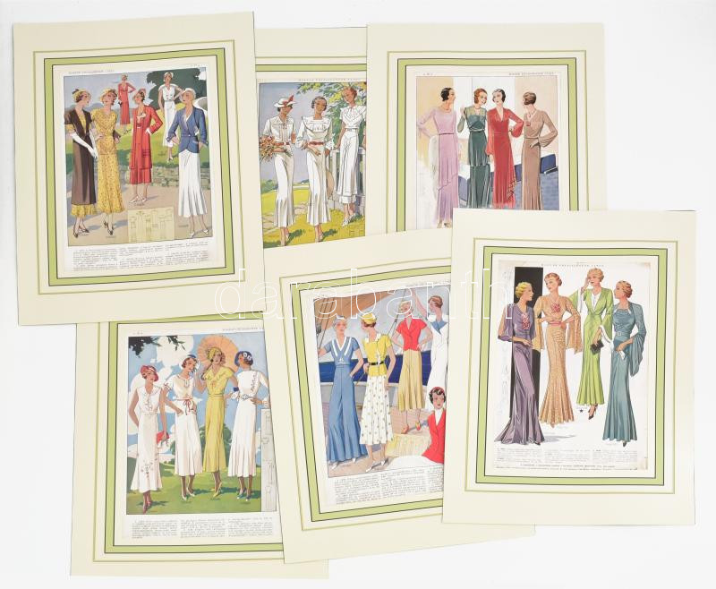 cca 1930 Hölgyek elegáns ruhában, össz. 6 db art deco női divatkép a Magyar Uriasszonyok Lapjából. Színes ofszet nyomat, papír, 2 db kissé sérült, modern paszpartuban, 28x20 cm