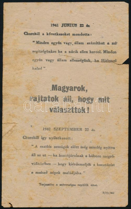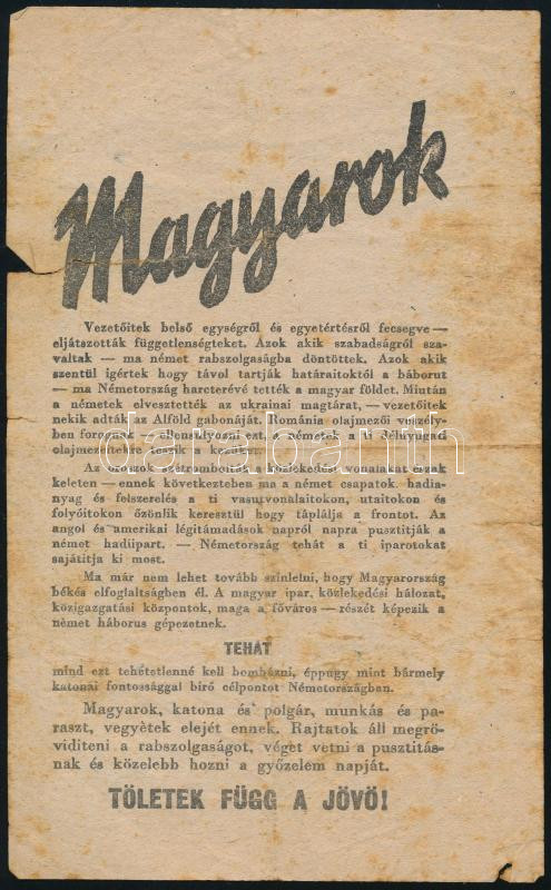 cca 1943 "Magyarok, rajtatok áll, hogy mit választotok" - szövetséges ... https://www.darabanth.com/de/455-Fernauktion/455.0/Kunst-Dokumente-andere-Sammelgebiete/Drucksachen~2000012/cca-1943-Magyarok-rajtatok-all-hogy-mit-valasztotok-szovetseges-repulok-altal-terjesztett~II3036186