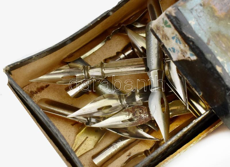 Beschreibung: 4 db régi papírdoboz (Popper Ernő Monor, Murillo, Crown Pens, Agis Pens), bennük különféle tollszemek (közte Schuler Évszázad toll és Jókai toll) + Müller Testvérek Rt. reklámos fémlemez tintaüveg tartó. Vegyes méretben és állapotban.