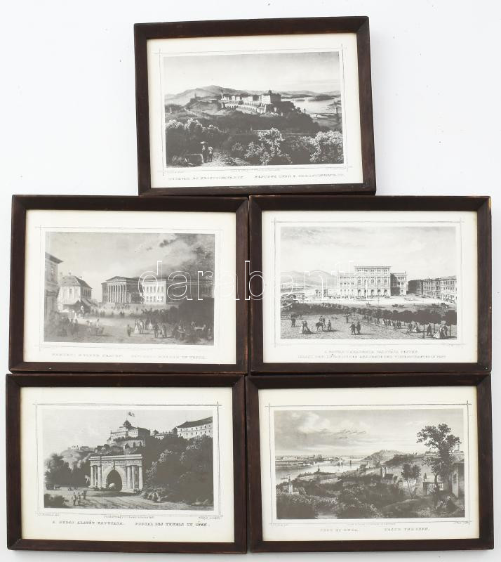 Beschreibung: 5 db budai és pesti látkép, régi acélmetszet után készült modern nyomat, üvegezett fakeretben, 12x18 cm körüli méretben