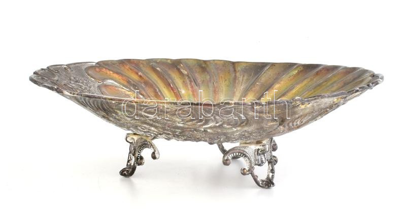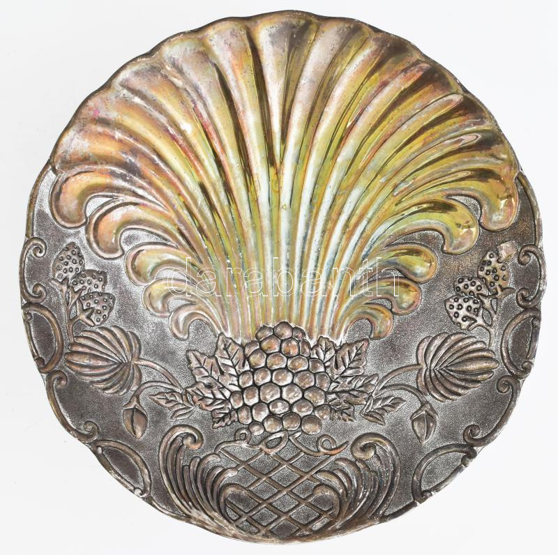 Beschreibung: Gyümölcsmintás ezüstözött kínáló, kopással, d: 22,5 cm, m: 6,5 cm