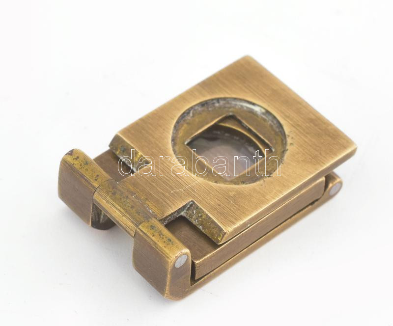 Beschreibung: Hutter és Schrantz réz szövőipari szövetsűrűség vizsgáló, tokjában, csukva cca 2.5x2 cm