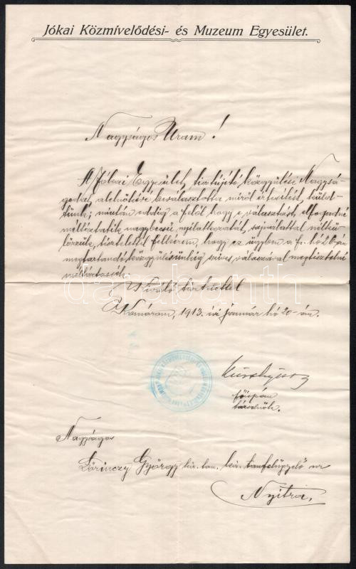 1913 Komárom, Jókai Közmívelődési- és Muzeum Egyesület levele Lőrinczy... https://www.darabanth.com/de/455-Fernauktion/455.0/Kunst-Dokumente-andere-Sammelgebiete/Historische-Dokumenten-Handschriften~500021/1913-Komarom-Jokai-Kozmivelodesi-es-Muzeum-Egyesulet-levele-Lorinczy-Gyorgy-reszere-akit-a~II3038592
