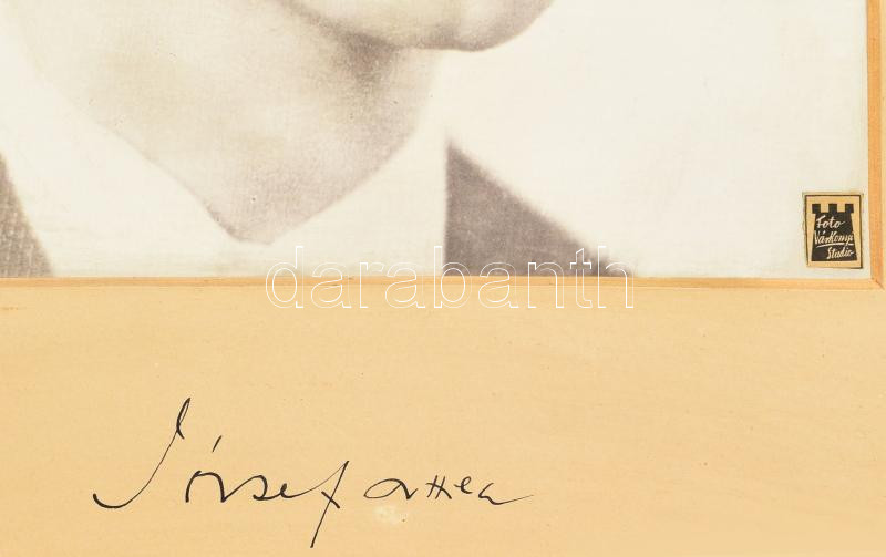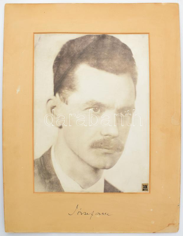 József Attila (1905-1937) költő nagy méretű fotója a paszpartun tintás aláírásával. Várkonyi fotó, matricával jelzett, Kopott. Fotó méret 37x27 cm Külső méret 58x42 cm