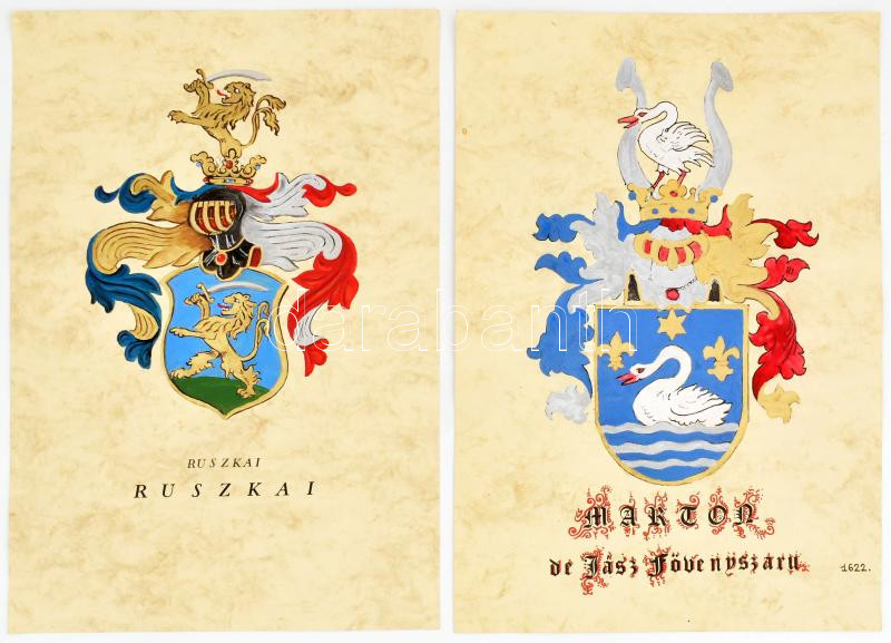 cca 2000 össz. 4 nemesi család címere (Kis- és nagybarkóczi Szmodis, Marton de Jász Födényszaru, ruszkai Ruszkai, gyergyószentmiklósi Lázár), családi név része nyomat, címer rész kézzel festett, papír, 42x30 cm