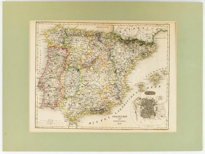 1849 Spanien und Portugal - Spanyolország és Portugália színezett acélmetszetű térképe.rajta Madrid térképe. . Gez. v. Hauptmann Radefeld.- v. H. Bornmüller. 210 x 263 mm paszpartuban / Engraved map of Spain and Portugal
