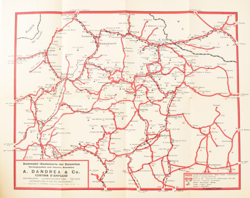 1931 Automobil-Routenkarte der Dolomiten / A Dolomitok autótérképe (Cortina d'Ampezzo és környéke), 1 : 320.000, Cortina d'Ampezzo, A. Dandrea & Co. kiadása, hátoldalán reklámokkal, árjegyzékkel. Kis szakadásokkal, 50x40,5 cm
