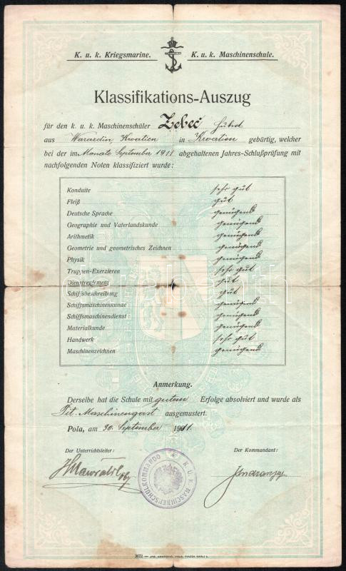 Beschreibung: 1911 k.u.k. Maschinenschule Pola tengerészeti gépész bizonyítvány / Hubert Zebec's grades at the k.u.k. Mechanics School, dated in 1911