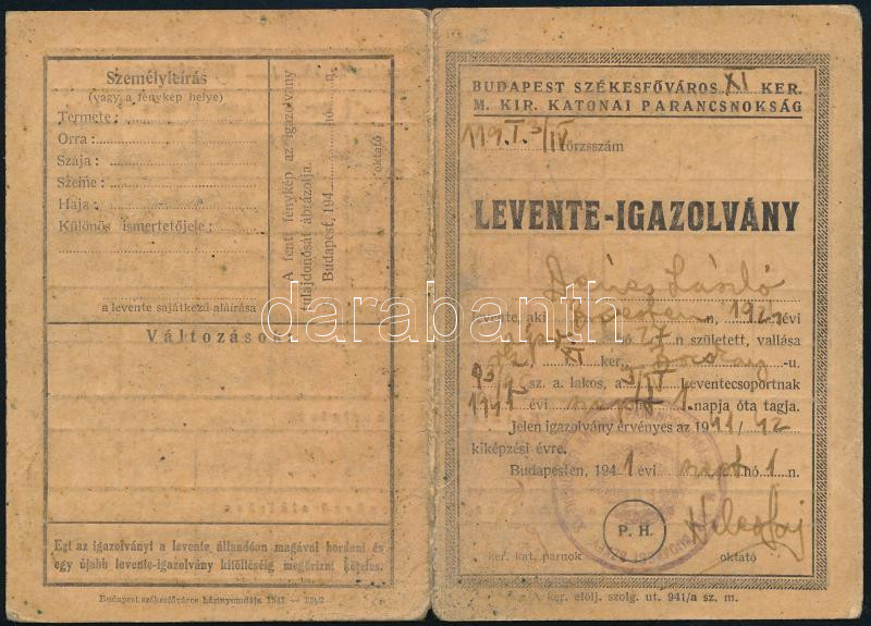 1941 Bp., Levente igazolvány, M. Kir. Budapest Szfv. XI. Kerületi Kato... https://www.darabanth.com/de/455-Fernauktion/455.0/Kunst-Dokumente-andere-Sammelgebiete/Militaria~2000008/1941-Bp-Levente-igazolvany-M-Kir-Budapest-Szfv-XI-Keruleti-Katonai-parancsnoksag-belyegzovel~II3033530
