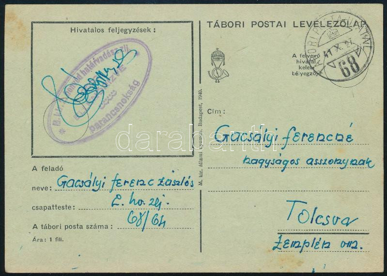 Beschreibung: 1941 Tábori postai levelezőlap "Tábori Postahivatal / 68' M. kir. 2. honvéd határvadász zlj. parancsnokság / ellenőrizve"