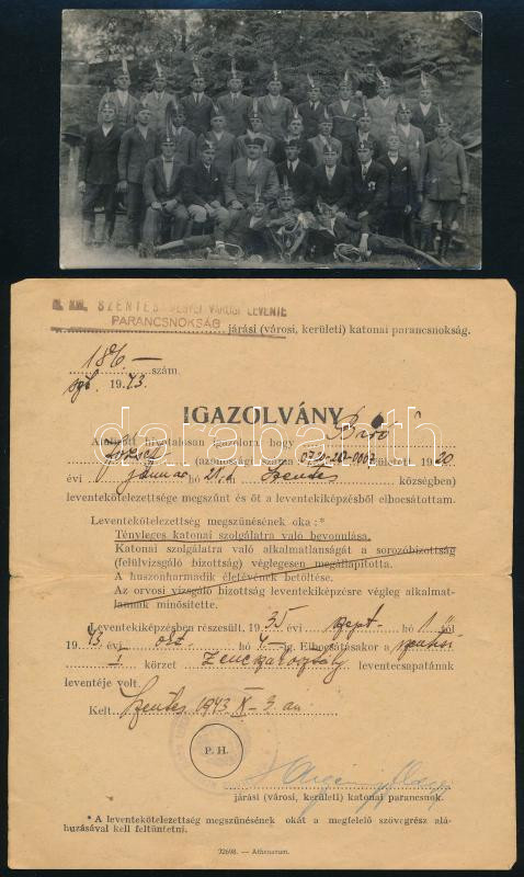 1943 Szentes, levente elbocsátó igazolvány Bíró József, a szentesi zeneszakosztály leventecsapatának tagja részére + A szentesi levente zeneszakosztály csoportképe, fotólap, hátoldala foltos, 13,5x8,5 cm
