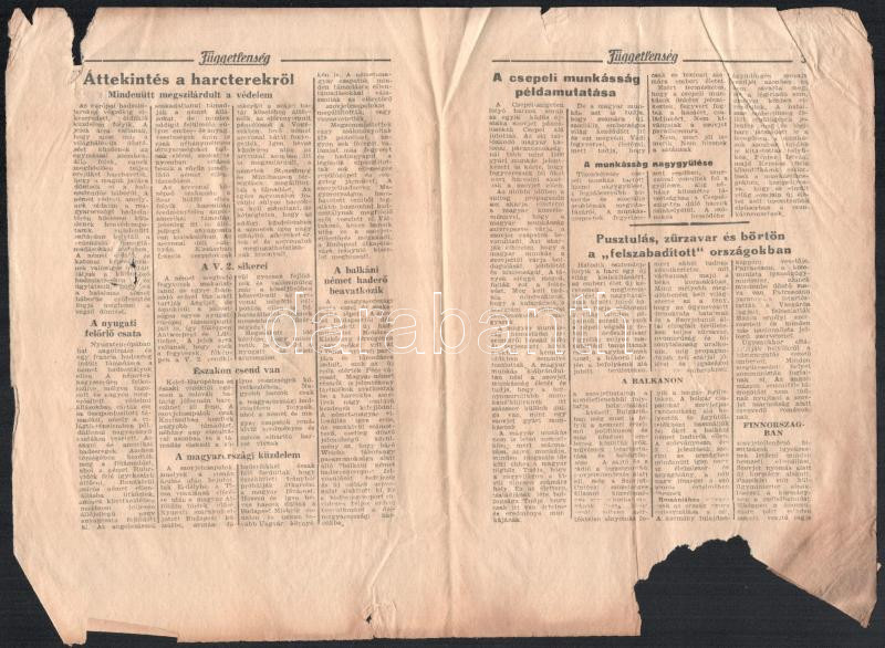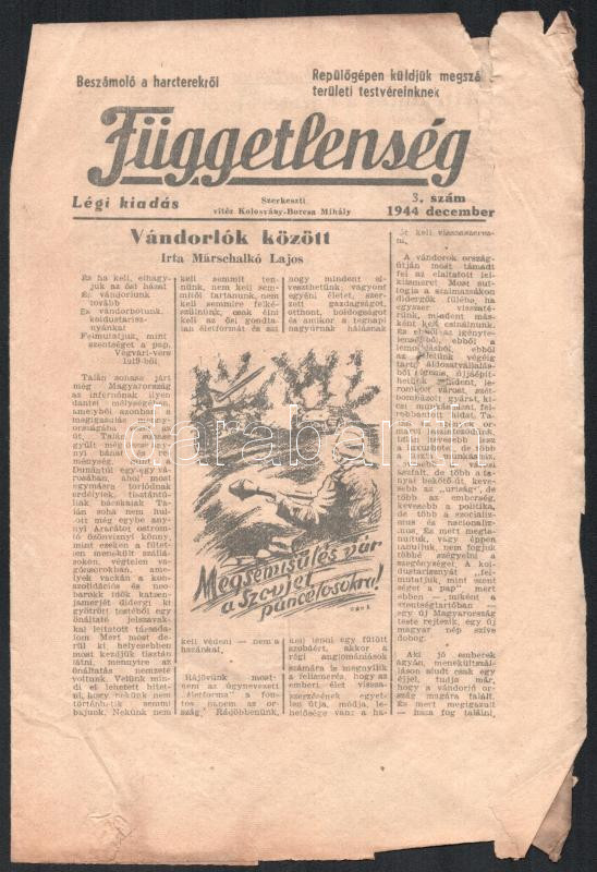 1944 A Függetlenség c. nemzetiszocialista lap 3. száma, repülőgépen le... https://www.darabanth.com/de/455-Fernauktion/455.0/Kunst-Dokumente-andere-Sammelgebiete/Militaria~2000008/1944-A-Fuggetlenseg-c-nemzetiszocialista-lap-3-szama-repulogepen-ledobott-ropujsag-a-megszallt~II3030255