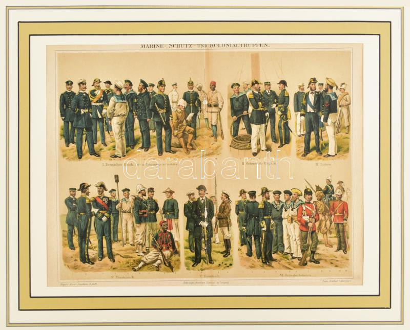 cca 1900 színes haditengerész, gyarmati katonai (közte Ausztria-Magyarország) témájú illusztráció a Meyer's Lexikon 5. kiadásából, nyomat, papír, kissé sérült, modern paszpartuban, 21x27 cm