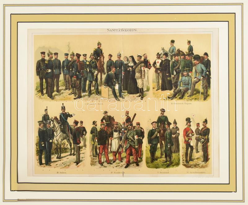 cca 1900 színes katonai szanitéc (közte Ausztria-Magyarország) témájú illusztráció a Meyer's Lexikon 5. kiadásából, nyomat, papír, kissé sérült, modern paszpartuban, 21x27 cm