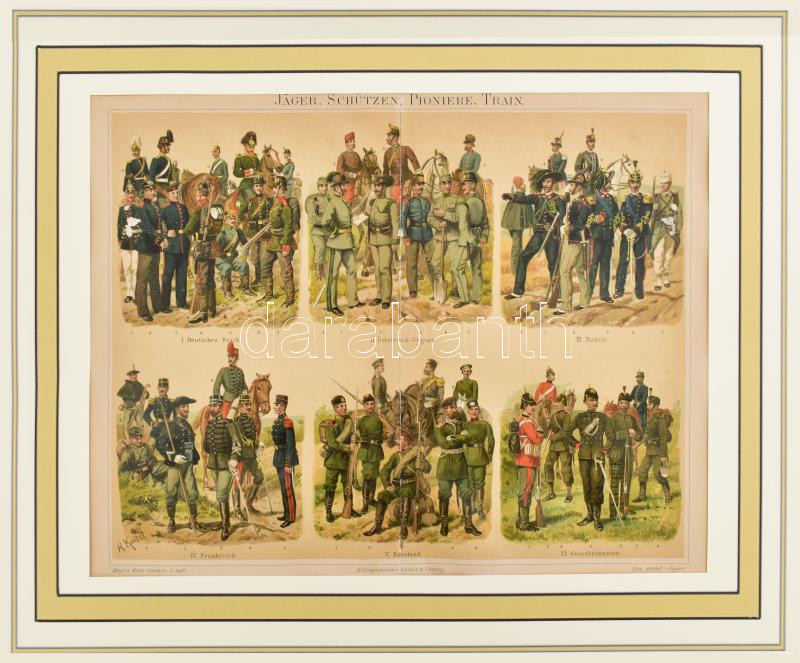 cca 1900 színes vadász, lövész, utász, trén katonai (közte Ausztria-Magyarország) témájú illusztráció a Meyer's Lexikon 5. kiadásából, Richard Knötel (1857-1914) után, nyomat, papír, kissé sérült, modern paszpartuban, 21x27 cm