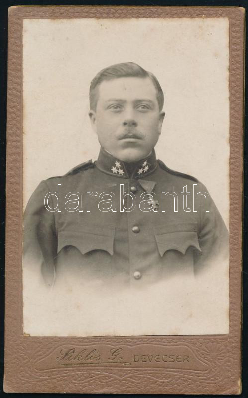 cca 1910 Katonaportré, keményhátú fotó Siklós Géza devecseri műtermébő... https://www.darabanth.com/de/455-Fernauktion/455.0/Kunst-Dokumente-andere-Sammelgebiete/Militaria~2000008/cca-1910-Katonaportre-kemenyhatu-foto-Siklos-Geza-devecseri-mutermebol-10-5x6-5-cm~II3035561