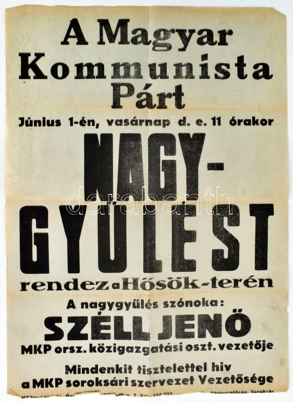 1945 a Magyar Kommunista Párt nagygyűlésének plakátja 30x45 cm Alja sé... https://www.darabanth.com/de/455-Fernauktion/455.0/Kunst-Dokumente-andere-Sammelgebiete/Plakat~2000013/1945-a-Magyar-Kommunista-Part-nagygyulesenek-plakatja-30x45-cm-Alja-serult~II3030213