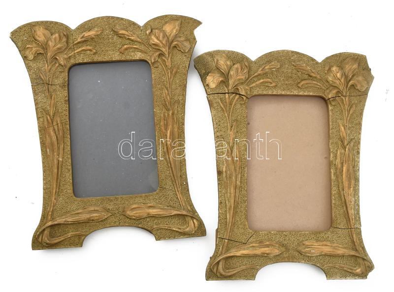 Beschreibung: 2 db szecessziós stílusú, asztali, kitámasztható üvegezett fa képkeret, mindkettő sérült. Látható méret: 17,3x10,3 cm