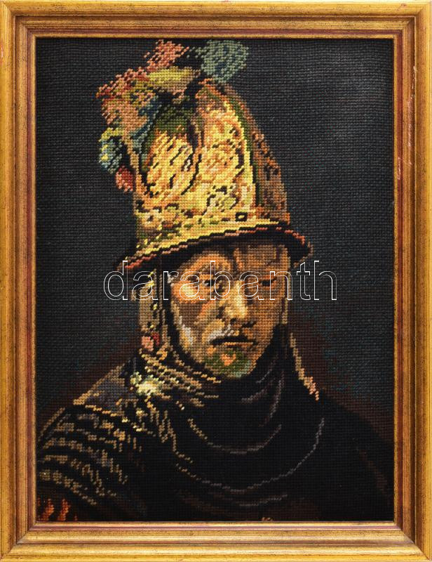 Beschreibung: Dekoratív fa képkeret, Rembrandt után készült szövetképpel, látható méret: 42x31,5 cm.
