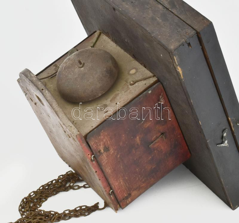 Beschreibung: Parasztóra XIX. sz vége, XX. sz eleje, festett fa és réz, súlyokkal, üvegezett keretben 24x20 cm Működik