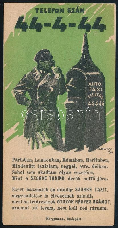 1930 Szürke taxi, telefon: 44-4-44 számolócédula, Abonyi Zoltán grafik... https://www.darabanth.com/de/455-Fernauktion/455.0/Kunst-Dokumente-andere-Sammelgebiete/Werbungen~2000036/1930-Szurke-taxi-telefon-44-4-44-szamolocedula-Abonyi-Zoltan-grafikaja~II3041357