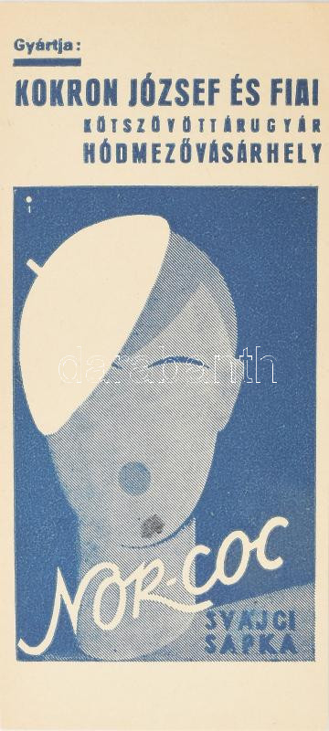 cca 1920-1930 Nor-Coc svájci sapka, Kokron József és Fiai Kötszövöttár... https://www.darabanth.com/de/455-Fernauktion/455.0/Kunst-Dokumente-andere-Sammelgebiete/Werbungen~2000036/cca-1920-1930-Nor-Coc-svajci-sapka-Kokron-Jozsef-es-Fiai-Kotszovottarugyar-Hodmezovasarhely~II3041431