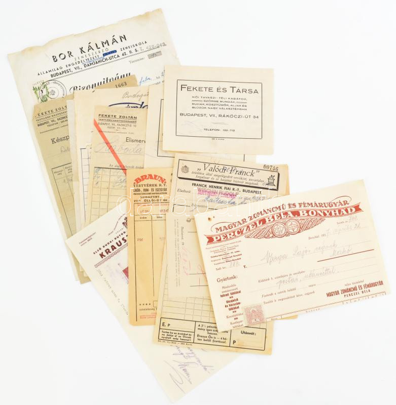 cca 1930-1940 Vegyes számla tétel, 11 db, közte Bonyhád, Perczel Béla Magyar Zománcmű és Fémárugyár, Franck Henrik és Fiai, Grüttert óra, ékszer, ezüst és aranyáruk, Braun Testvérek Rt., ...stb.