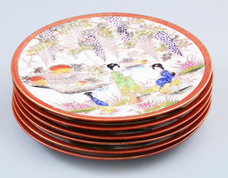 Beschreibung: Japán gésa mintás süteményes tál szett, jelzett, hibátlan, d: 19 cm