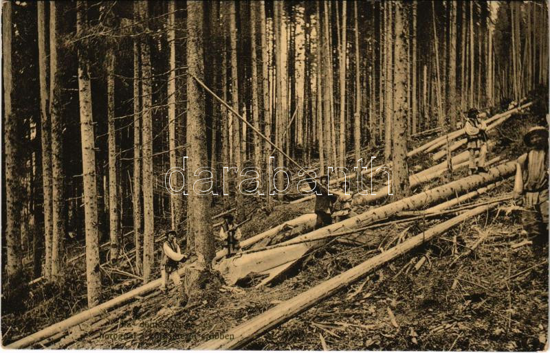 Kőrösmező, Yasinia, Yasinya, Jassinja, Jasina (Máramaros); Fa döntése fejszével és horoggal a kőrösmezői erdőben. Benkő Miklós kiadása / felling of the trees with ax and hook (EK)