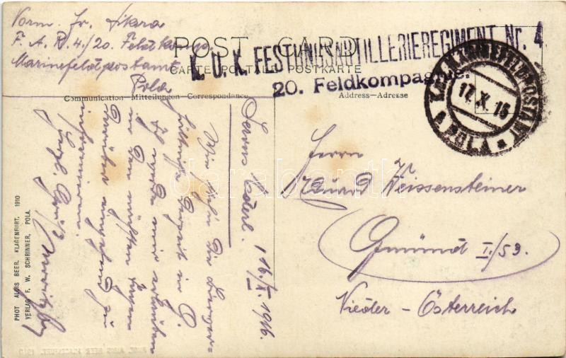 Beschreibung: 1916 K.u.k. Kriegsmarine HEARTSEASE. Phot. Alois Beer, F.W. Schrinner + "K.U.K. FESTUGSARTILLERIEREGIMENT Nr. 4 20. Feldkompagnie" (fl)