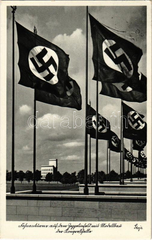 Nürnberg, Stadt der Reichsparteitage, Fahnentürme auf dem Zeppelinfeld mit der Kongresshalle / German Nazi propaganda with swastika flags + "1938 Nürnberg Reichsparteitag der NSDAP" So. Stpl